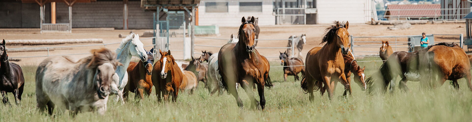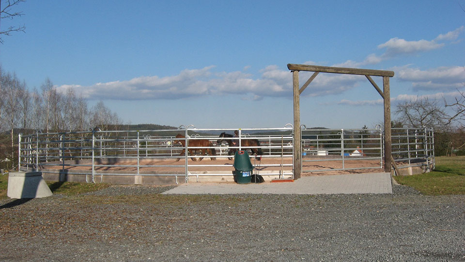 Insgesamt stehen unseren Pensionspferden über 10.000 qm befestigte Fläche für den Ganzjahresauslauf sowie rund 6 ha Weidefläche offen. Das Pferdedorf hält außerdem viele Trainingsmöglichkeiten wie Außenreitplatz, Reitwiesen, Reithallen und Round-Pen für alle Ansprüche bereit.