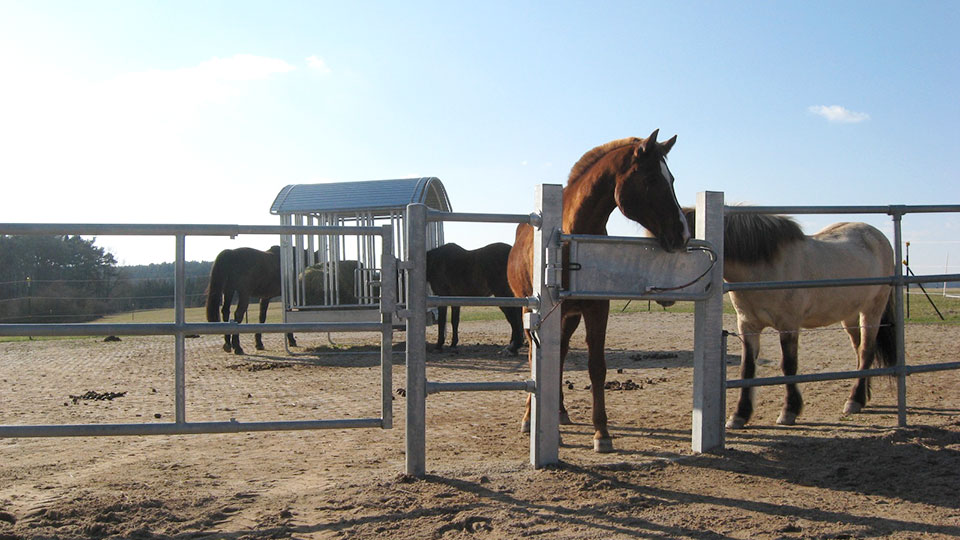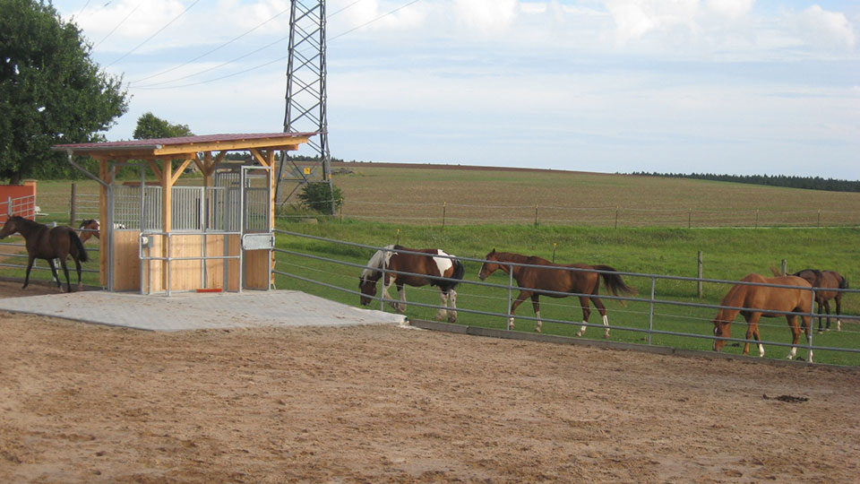 Maschinenhalle wird zur Reithalle, Ergänzung von Heuautomaten und Selektionstor für die Weide
